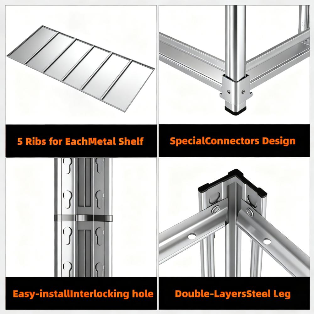 5-Tier Metal Shelf Unit: Built with reinforced, double-layered uprights, these shelves provide superior load-bearing capacity for long-lasting stability. Each shelf features 5 reinforcing rods and 1 back support rib, ensuring even weight distribution for safe storage of heavy items.